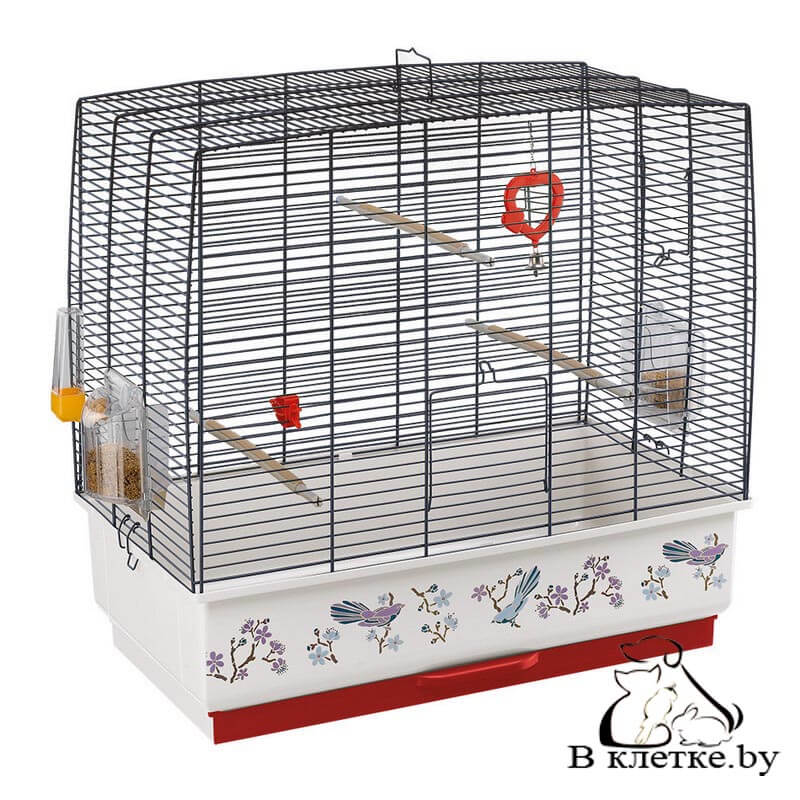 Ferplas Record 4 - прямоугольная клетка средних размеров для канареек, экзотических и других маленьких птиц. Пластиковый поддон украшен декоративным рисунком с изображением цветов и птиц, нанесенным с использованием передовых технологий, обеспечивающих стойкость рисунка. Клетка изготовлена из прочной окрашенной стальной проволоки и оснащена удобной дверкой в передней части. Record 4 идет в комплекте с аксессуарами, среди которых: пластиковые жердочки, поворотные кормушки Brava 2, прищепки для подкормки, игрушка-зеркало с маленьким колокольчиком. Клетку очень удобно чистить благодаря выдвижному подносу для сбора мусора, а глубокий поддон предотвращает просыпание мусора. Внимание: мы рекомендуем мыть клетку простой мыльной водой во избежание повреждения декоративного рисунка.