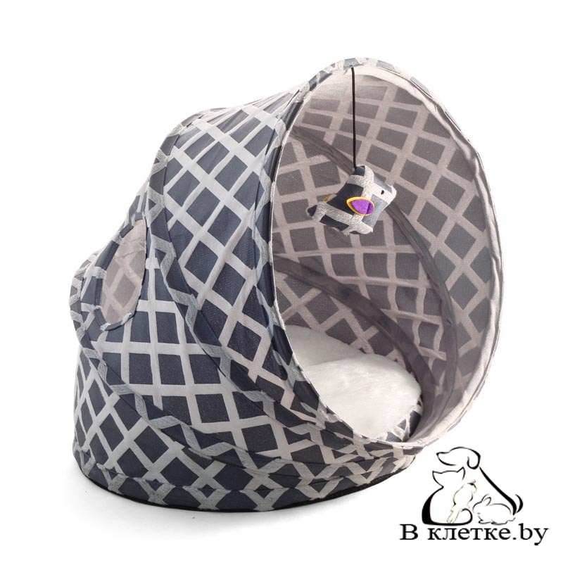 Оригинальная лежанка для усатых-полосатых - мягкое и уютное спальное место, где можно не только отдыхать, но и наблюдать за всем происходящим вокруг. Туннель выполнен из натурального материала и удобно складывается за счет эргономичного корпуса. Внутри имеется мягкая съемная подушка, а подвешенная игрушка станет дополнительным элементом для игры. Размеры: 430х380х350мм. Цвет: серый в клетку