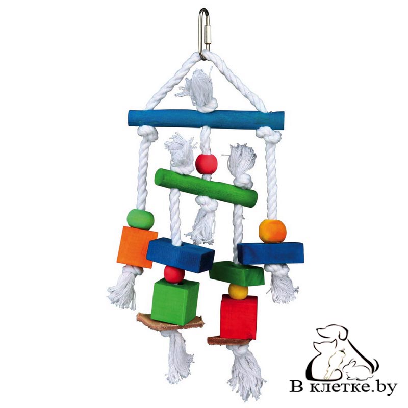 Разноцветная игрушка из дерева Trixie 58985 представляет собой верёвку с деревянными фигурками и кусочками кожи. Подходит для волнистых попугаев, корелл.