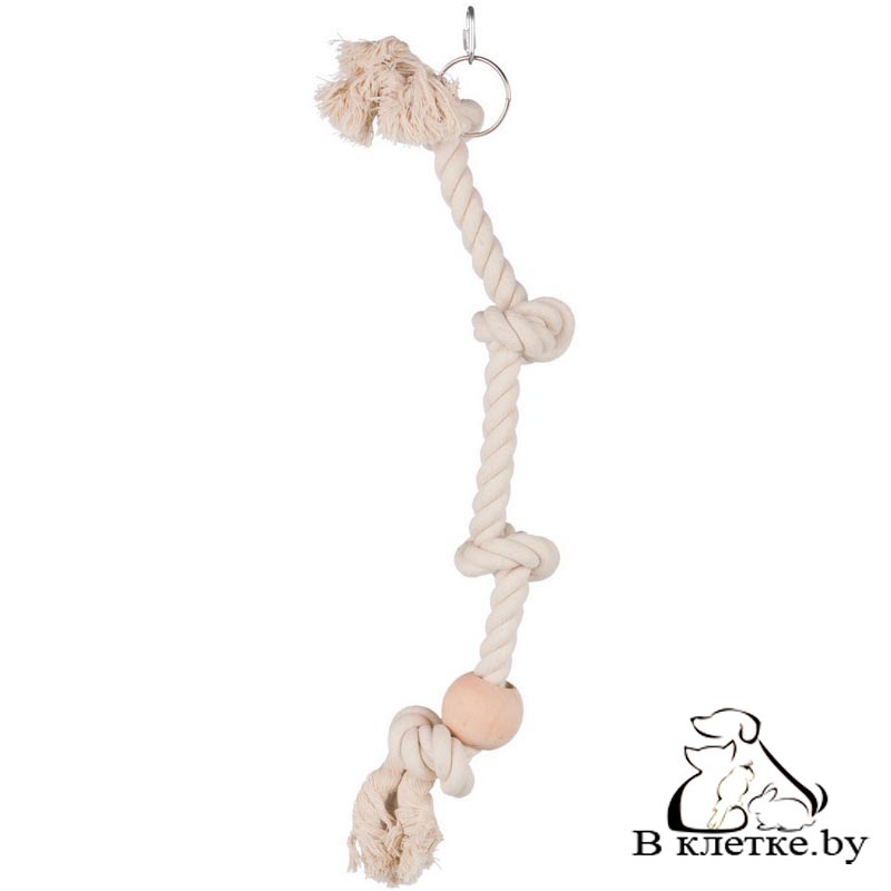 Веревка для птиц Trixie 5168 изготовлена из чистого хлопка. Канатик с деревянной бусиной и узлами предназначен для длиннохвостых попугаев