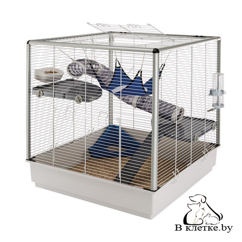 Furat Extra Large - клетка для хорьков из окрашенной стальной проволоки, а также пластиковых рамок по периметру и поддона. На крыше и спереди расположены большие открывающиеся двери, облегчающие процесс ежедневной уборки. Аксессуары в комплекте: прямоугольный туалет для хорьков, пластиковая кормушка, пластиковые полки с лесенками, гамак с цепочками для подвешивания к клетке. Также в клетке имеются подвесные пластиковые туннели для игр вашего маленького питомца. Они могут также соединять различные уровни клетки. Furat Extra Large можно чистить полностью, благодаря съемному поддону.