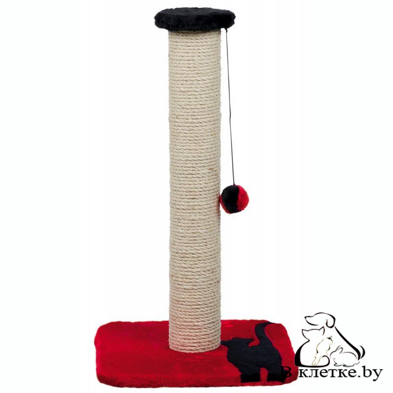 Когтеточка-столбик с игрушкой на верёвочке и рисунокм кощки Trixie Mendi имеет основание из плюша, столбик обкручен сизалем.