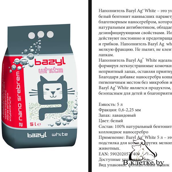 Антибактериальный наполнитель Bazyl Ag+ – это первый и единственный на рынке наполнитель с добавлением ионов наносеребра! Наносеребро, являющееся натуральным антибиотиком, обладает антисептическими и дезинфицирующими свойствами. Действует постоянно и предотвращает развитие бактерий и грибков. Полностью нейтрализует неприятный запах. Добавление наносеребра приводит к тому, что кошачий лоток всегда остается стерильно чистым, без бактерий и микробов. Наносеребро является безопасным даже для маленьких детей и оказывает благоприятное влияние на аллергиков. Знания на тему благотворного воздействия ионов наносеребра постоянно углубляются, а благодаря своим достоинствам ионы наносеребра находят сейчас применение во многих отраслях науки: медицине, фармацевтике, косметологии, сельском хозяйстве и садоводстве. Применение ионов наносеребра в подстилках для мелких домашних животных является изобретением, запатентованным Celpap в Патентном управлении Республики Польша. «White» превосходно комкуется и формирует плотные, легкоустранимые кусочки. Наполнитель с добавлением наносеребра Bazyl Ag+ рекомендованы для владельцев котов, для которых ультрагигиеничная чистота в лотке принципиально важна!