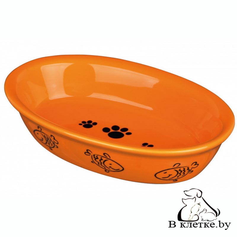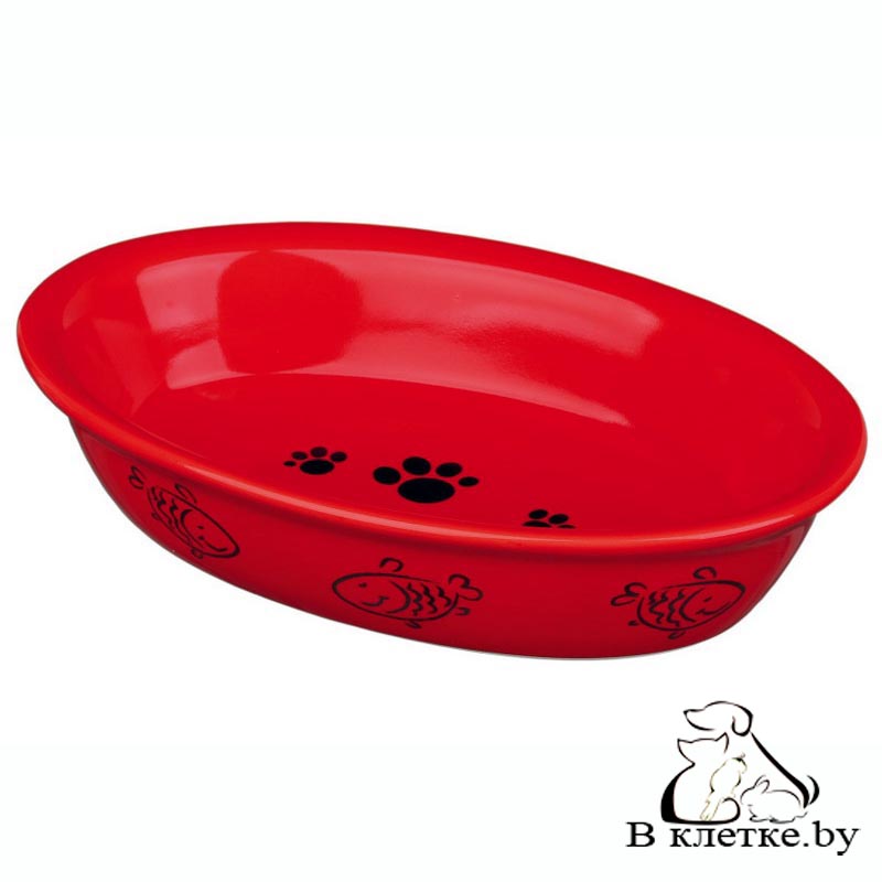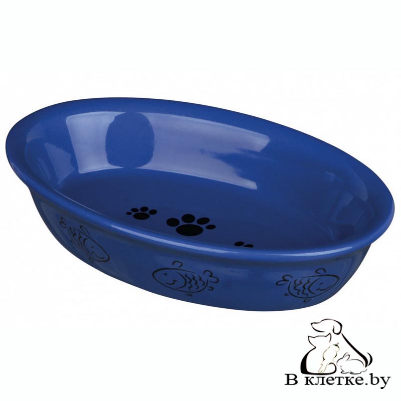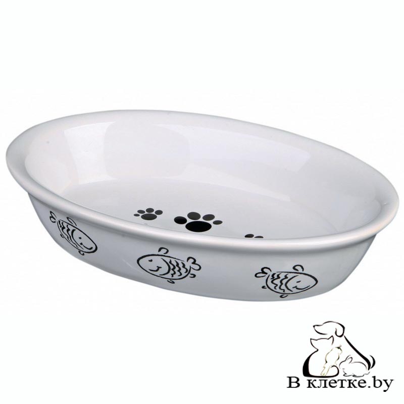 Овальная миска для кошек Trixie с рисунками лапок и рыбок изготовлена из качественной керамики. Возможны различные варианты расцветки.