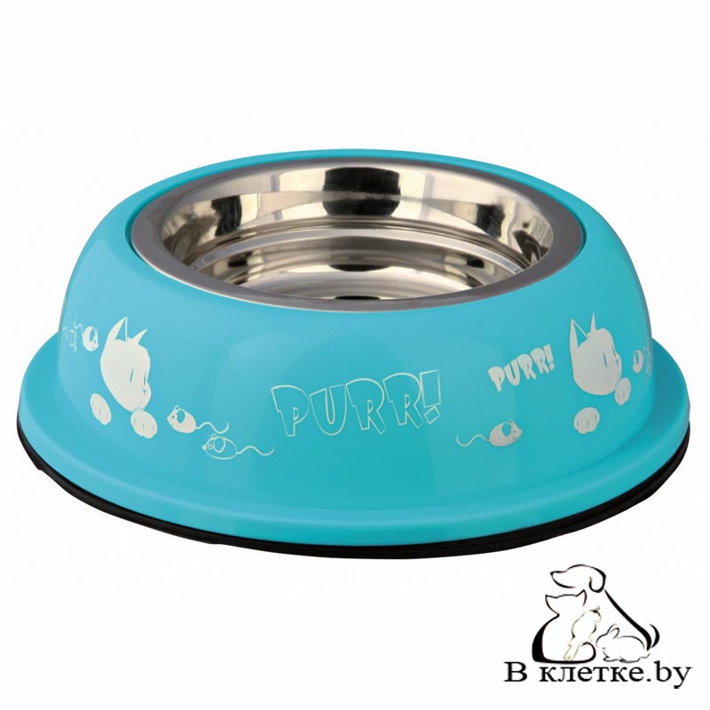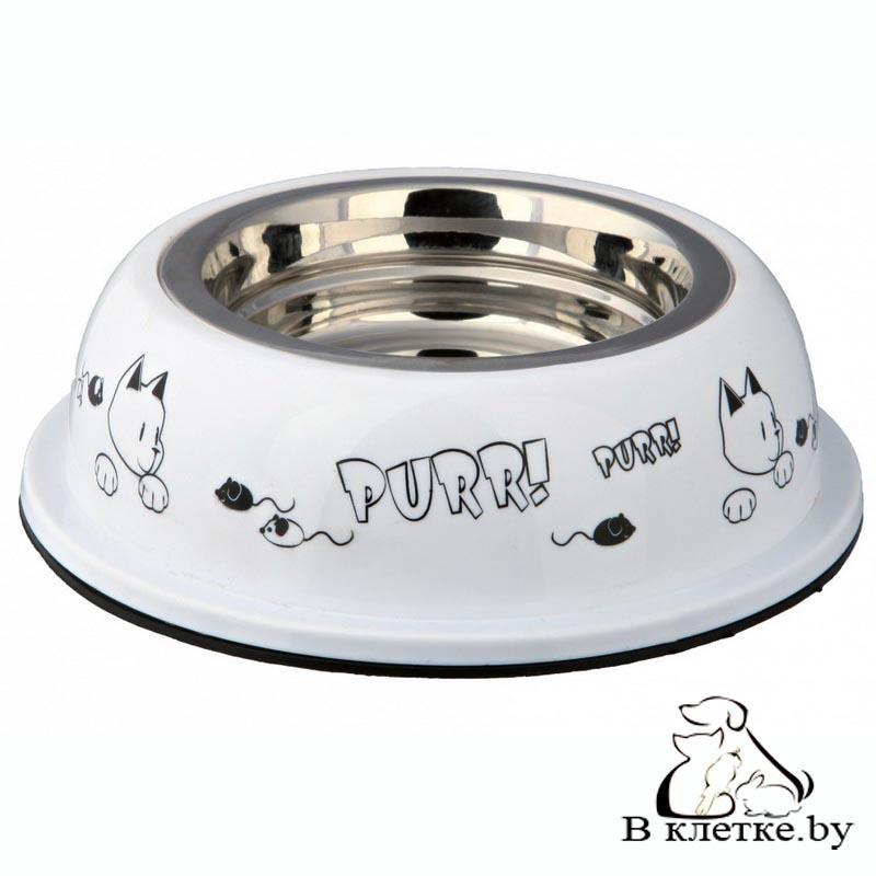 Миска для кошек с рисунком Trixie 2468 изготовлена из нержавеющей стали, с пластмассовым держателем. Не скользит благодаря резиновому ободу. Возможны различные варианты расцветки.