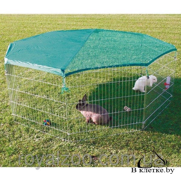 Уличный загон c защитной сеткой natura состоит из 8 элементов размером по 80x75см каждый. Элементы изготовлены из оцинкованного металла. Загон оборудован дверцей. При эксплуатации есть возможность совмещения с дополнительной зоной выгула. Специальная сетка предотвращает выпрыгивание животных и защищает от хищных птиц и кошек, часть крыши-сетки сделана из непрозрачного материала для защиты от солнца. Размер ячейки сетки 1х1см.